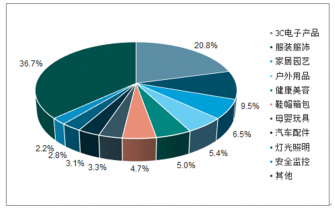 2017年中國(guó)出口跨境電商賣(mài)家品類(lèi)主要分布在:3C電子產(chǎn)品20.8%、服裝服飾9.5%、家居園藝6.5%、戶外用品5.4%、健康美容5%、鞋帽箱包4.7%、母嬰玩具3.3%、汽車(chē)配件3.1%、燈光照明2.8%、安全監(jiān)控2.2%、其他36.7%。