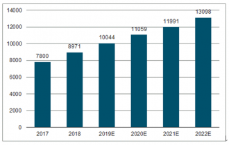 2017-2022年中國光棒產(chǎn)量增長情況預(yù)測(噸)