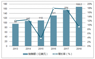 2013-2019年全球工業(yè)機(jī)器人銷(xiāo)售額以及增長(zhǎng)率圖