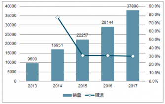 2013-2017年國(guó)產(chǎn)工業(yè)機(jī)器人銷(xiāo)量及占比圖