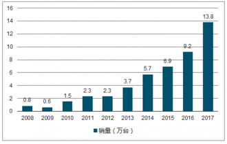 2008--2017年中國(guó)工業(yè)機(jī)器人銷(xiāo)量圖