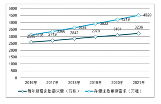 2016-2021年中國每年新增床墊需求量及存量床墊更新需求情況