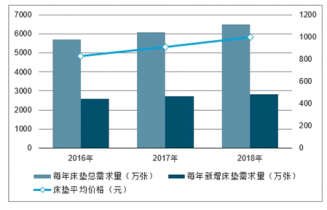 2016-2018年中國每年床墊總需求量、每年新增床墊需求量及床墊平均價(jià)格走勢