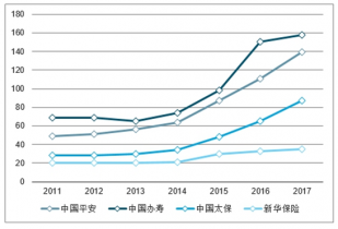 受行業(yè)政策影響,2010年起,中國平安、中國人壽、中國太保及新華保險開始逐步加強(qiáng)個險渠道發(fā)展。2013年起,上述四家公司代理人規(guī)模均逐步上升;保險從業(yè)資格考試的取消后,2015年,中國平安、中國人壽、中國太保及新華保險當(dāng)年代理人同比增速分別達(dá)到36.9%、31.8%、40.1%、46.1%,增速驟然提升。2013-2017年間,中國平安、中國人壽、中國太保及新華保險代理人數(shù)量分別實現(xiàn)年復(fù)合增長率25.6%、24.7%、30.5%及14.7%。