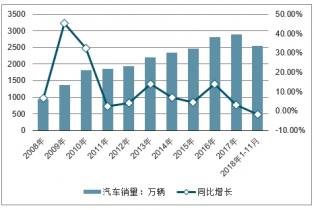 2008-2018年中國汽車銷量及同比增長走勢