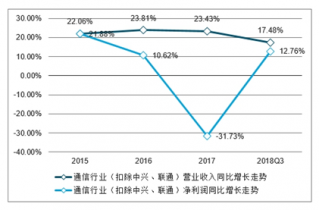 通信行業(yè)(扣除中興、聯(lián)通)營業(yè)收入、凈利潤同比增長走勢