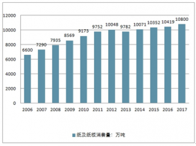 2006-2017年中國紙及紙板消費量變化趨勢圖(單位:萬噸,%)