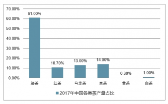 目前,茶葉市場中綠茶、烏龍茶占據主要份額,2017年二者比重分別為61%、13%;但近年的產量比重在下降。同時,普洱茶、紅茶、白茶等其他茶葉份額逐漸提升,紅茶、黑茶、白茶、黃茶等茶類占26%。此外,市場上的柑普茶、柑紅茶、花草茶等特色產品及超微茶粉、抹茶、茶飲料、茶保健品等精深加工產品也在增加。