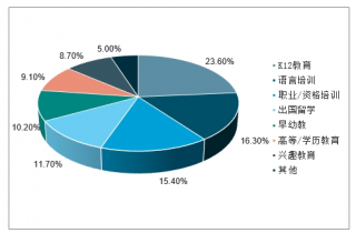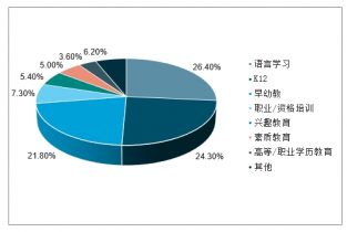 中國在線教育產(chǎn)品類型方面,K12、語言培訓、職業(yè)教育三者占比超50%,是在線教育市場主要的產(chǎn)品類型。受國家二孩政策的影響,兒童早教類產(chǎn)品市場占比在不斷面擴大。