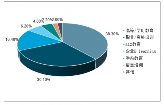 中國在線教育市場份額方面,高等/學歷教育、職業(yè)/資格培訓市場占比近七成,其中,高等/學歷教育市場占比最高,為38.3%。高等/學歷教育、職業(yè)/資格培訓藝考龐大的社會剛需,一直占據(jù)著整個在線教育市場的主要份額,隨著國家二孩政策的全面開放以及80/90后父母教育意識的增強,學前教育和K12教育迎來了新的發(fā)展契機,市場占比在逐步擴大。