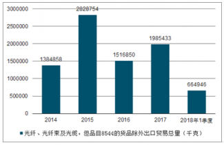 2014-2018年1季度光纖、光纖束及光纜,但品目8544的貨品除外出口貿(mào)易總量走勢(shì)圖(單位:千克)