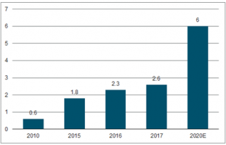 在政策指引下,我國新材料行業(yè)發(fā)展強勁,總產(chǎn)值已從2010年的0.6萬億元增加至2017年的2.6萬億元。按照當(dāng)前增長勢頭,預(yù)計到2020年,我國新材料產(chǎn)業(yè)總產(chǎn)值將超過6.0萬億元。