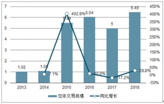 2013-2019年北京產(chǎn)權(quán)交易所總體交易規(guī)模及增速