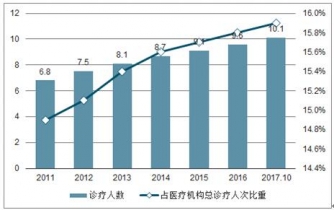 截止2017年10月,診療人數(shù)達(dá)到10.1億人次,同時(shí),中醫(yī)類醫(yī)療機(jī)構(gòu)診療人次占醫(yī)療機(jī)構(gòu)總診療人次的比重也在持續(xù)增加,7年間增加了1個(gè)百分點(diǎn)。這表明,中醫(yī)類醫(yī)療機(jī)構(gòu)的服務(wù)能力提高,在整個(gè)醫(yī)療體系中所起的作用越來越大。