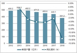 2013年啤酒產(chǎn)量達到506.2億升。此后啤酒產(chǎn)量逐年下降。2019年,全國啤酒產(chǎn)量381.2億升,同比下降13.38%。