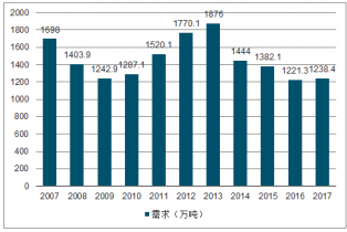 隨著人們生活水平的提高,全國市場越來越多消費(fèi)者開始注重品牌,吃品牌食糖也成為了一種趨勢。在這樣一個(gè)大背景下,許多食糖企業(yè)已經(jīng)開始全國布局,而不僅限于區(qū)域競爭。對(duì)于食糖行業(yè)來說,行業(yè)進(jìn)入整合期,未來食糖行業(yè)集中會(huì)有所提高。近幾年,我國食糖行業(yè)消費(fèi)量情況呈現(xiàn)下降態(tài)勢,從2013年的1876萬噸最高峰值,下降到2017年的1238.4萬噸。如下圖所示: