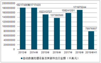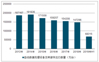2013-2019H1中國自動數(shù)據(jù)處理設(shè)備及其部件出口數(shù)量及出口金額統(tǒng)計(jì)表