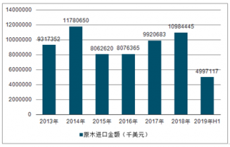 2013-2019H1中國原木進(jìn)口數(shù)量及進(jìn)口金額統(tǒng)計表
