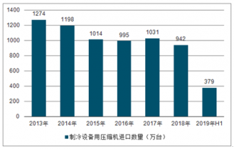 2013-2019H1中國制冷設(shè)備用壓縮機進口數(shù)量及進口金額統(tǒng)計表