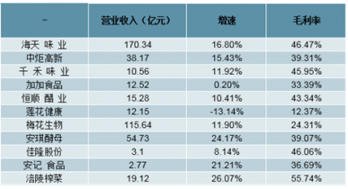 整體來看,我國調(diào)味品行業(yè)具有較快的增長和較好的盈利能力。在以下幾家調(diào)味品上市企業(yè)中,除加加食品、蓮花健康以及佳隆股份外,均保持了10%以上的增速,行業(yè)毛利率也基本維持在30%—50%左右。