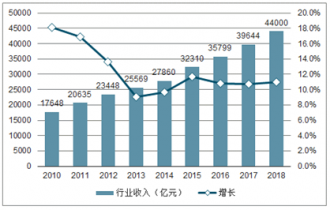 2010-2019年中國餐飲行業(yè)收入及增速圖