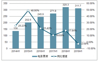 圖表1:2015-2019年全球電影市場票房收入情況及同比增速(單位:億美元,%)