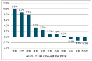 全球前十化妝品消費(fèi)國(guó)2009-2018復(fù)合增長(zhǎng)率
