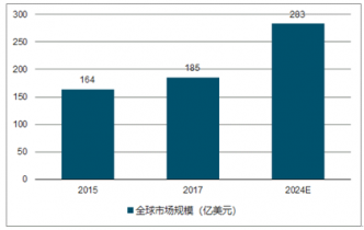 數(shù)據(jù)顯示全球內(nèi)窺鏡市場(chǎng)規(guī)模從 2015 年的 164 億美元增長(zhǎng)到 2017年的 185 億美元,預(yù)計(jì) 2024 將將達(dá)到 283 億美元,復(fù)合增速約為 6%。
