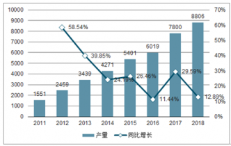 2011-2019年中國光纖預制棒產(chǎn)量及增長