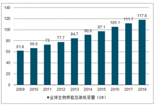 為了應(yīng)對能源短缺、環(huán)境污染等問題,在全球各國積極支持和推動生物質(zhì)能發(fā)電項目。生物質(zhì)能裝機容量實現(xiàn)了持續(xù)穩(wěn)定的上升,2009年全球生物質(zhì)能裝機容量為61.8GW,至2019年達(dá)到117.8GW,年復(fù)合增長率達(dá)7.43%。
