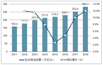 物流行業(yè)規(guī)模與經(jīng)濟(jì)增長速度具有直接關(guān)系,近十幾年的物流行業(yè)快速發(fā)展主要得益于國內(nèi)經(jīng)濟(jì)的增長,但是與發(fā)達(dá)國家物流發(fā)展水平相比,我國物流業(yè)尚處于發(fā)展期向成熟期過渡的階段。一方面物流企業(yè)資產(chǎn)重組和資源整合步伐進(jìn)一步加快,形成了一批所有制多元化、服務(wù)網(wǎng)絡(luò)化和管理現(xiàn)代化的物流企業(yè);一方面物流市場結(jié)構(gòu)不斷優(yōu)化,以“互聯(lián)網(wǎng)+”帶動的物流新業(yè)態(tài)增長較快;另一方面,社會物流總費(fèi)用與GDP的比率逐漸下降,物流產(chǎn)業(yè)轉(zhuǎn)型升級態(tài)勢明顯,物流運(yùn)行質(zhì)量和效率有所提升。但是,我國社會物流總費(fèi)用占GDP比重一直遠(yuǎn)高于發(fā)達(dá)國家,2016年中國該比例為14.9%,美國、日本、德國均不到10%,因此我國物流產(chǎn)業(yè)發(fā)展還有較大空間。2011-2018年,全國社會物流總額從158.4萬億元攀升至283.1萬億元,社會物流需求總體上呈增長態(tài)勢。