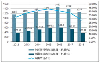2012-2019年中國(guó)原料藥市場(chǎng)規(guī)模及占比全球比重