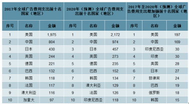 2017-2020年(預測),全球主要國家(地區(qū))的廣告費用支出及其變動情況(單位:億美元)