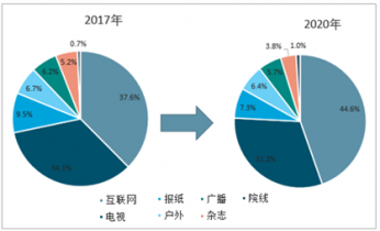 2017年及2020年(預(yù)測),全球廣告市場中不同媒體所占據(jù)的廣告花費支出比例情況