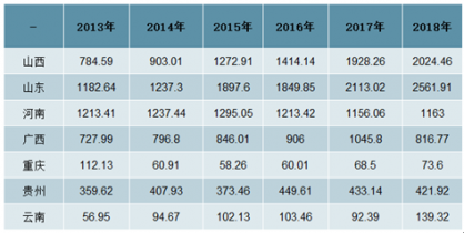 2013-2019年我國部分省市氧化鋁產(chǎn)量統(tǒng)計表:萬噸