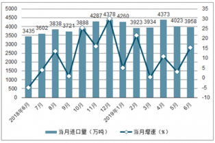 2019年6月份,進口原油3958萬噸,同比增長15.2%;,進口原油2.45億噸,同比增長8.8%,增速比一季度加快0.6個百分點。