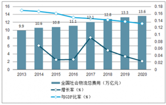 2013-2020年中國社會(huì)物流總費(fèi)用及其與GDP比率