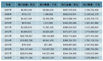 2007-2019年我國純堿進(jìn)出口統(tǒng)計表