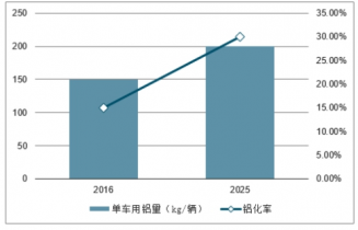 趨勢,鋁質材料是比較好的選項之一。汽車輕量化是要在保證汽車強度以及安全性能的前提之下,盡可能降低汽車的整備質量,從而提高汽車的動力性,減少燃油消耗,降低排氣污染。美國能源部報告顯示車重降低 10%可以使燃油經濟性提高 6%-8%,鋁以及鋁合金材料可為汽車 減重高達 30-60%。根據(jù)預測,到 2025 年歐洲產汽車的鋁含量可達到 200kg/輛, 鋁化率達到 30%;而目前歐洲汽車鋁含量 150kg/輛,鋁化率達 15%以上。目前國內每輛汽車的用鋁量約 110kg/輛,與發(fā)達國家差距仍比較明顯,預計 2020 年國內 汽車用鋁量將達 180kg/輛,我國汽車用鋁量將維持較高速度增長。