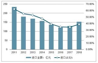 2011-2018年中國包裝機械進口金額及占比規模比重情況