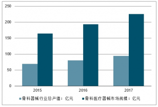 2015-2017年中國(guó)骨科醫(yī)療器械市場(chǎng)規(guī)模及骨科器械行業(yè)總產(chǎn)值走勢(shì)
