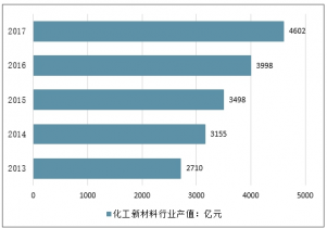 新材料是我國重點推進的戰(zhàn)略性新興產(chǎn)業(yè)之一。對于支撐整個戰(zhàn)略性新興產(chǎn)業(yè)發(fā)展,促進傳統(tǒng)產(chǎn)業(yè)轉(zhuǎn)型升級,保障國家重大工程建設(shè),具有重要戰(zhàn)略意義。受政策推動以及市場需求影響,我國新材料產(chǎn)業(yè)一直處于高速增長的發(fā)展?fàn)顟B(tài),尤其在我國化工新材料產(chǎn)業(yè)領(lǐng)域,產(chǎn)值從2013年的2710億元增長到2017年的4602億元,年均增長率為16%,行業(yè)發(fā)展初具規(guī)模
