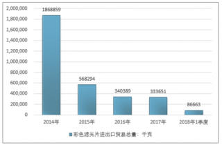 2016年我國(guó)彩色濾光片進(jìn)出口貿(mào)易總量340389千克 ,2017年進(jìn)出口貿(mào)易總量333651千克 ;2018年1季度進(jìn)出口貿(mào)易總量86663千克 。