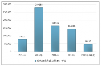2016年我國(guó)彩色濾光片出口總量164315千克 ,2017年出口總量144616千克 ;2018年1季度出口總量48219千克 。