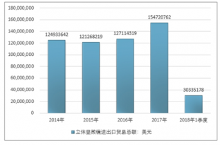 2016年我國立體顯微鏡進(jìn)出口貿(mào)易總額127114319美元,2017年進(jìn)出口貿(mào)易總額154720762美元;2018年1季度進(jìn)出口貿(mào)易總額30335178美元。