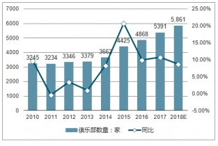 2010-2018年中國健身俱樂部數(shù)量及同比增速