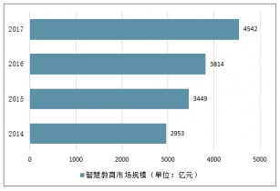 2014年我國(guó)智慧教育市場(chǎng)規(guī)模低于2953億元,截至2017年末,我國(guó)智慧教育市場(chǎng)規(guī)模超過(guò)4542億元,年復(fù)合增長(zhǎng)率達(dá)22.86%。