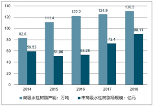 2014-2018年我國(guó)高吸水性樹(shù)脂產(chǎn)能及行業(yè)市場(chǎng)規(guī)模走勢(shì)