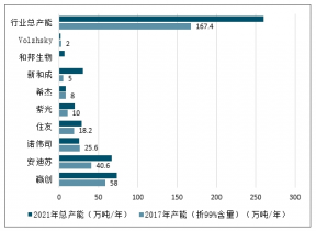 (萬(wàn)噸/年) | 2017年產(chǎn)能(折99%含量) | 產(chǎn)能分布 | 2019年新增產(chǎn)能 | 2019年新增產(chǎn)能 | 2020年新增產(chǎn)能 | 2021年新增產(chǎn)能 | 2021年總產(chǎn)能 |