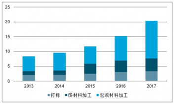 材料加工是光纖激光器最大的應(yīng)用領(lǐng)域。光纖激光器的用途可以為打標(biāo)、微材料加工、宏觀材料加工三大類。其中,微材料加工包括了除打標(biāo)以外,所有輸出功率小于1,000W的激光器應(yīng)用;宏觀材料加工包括了所有輸出功率大于等于1,000W的激光器應(yīng)用,主要為金屬切割和焊接。近年來,光纖激光器市場規(guī)模保持增長,其中,用于宏觀材料加工的激光器市場規(guī)模增長迅速,從2013年的5.12億美元增加至2017年的12.68億美元,年復(fù)合增長率為25.42%;用于打標(biāo)的光纖激光器市場規(guī)模從2013年2.01億美元增長至2017年的3.26億美元,年復(fù)合增長率為12.85%;用于微材料加工的光纖激光器市場規(guī)模從2013年的1.27億美元增加至2017年的4.44億美元,年復(fù)合增長率為36.69%。